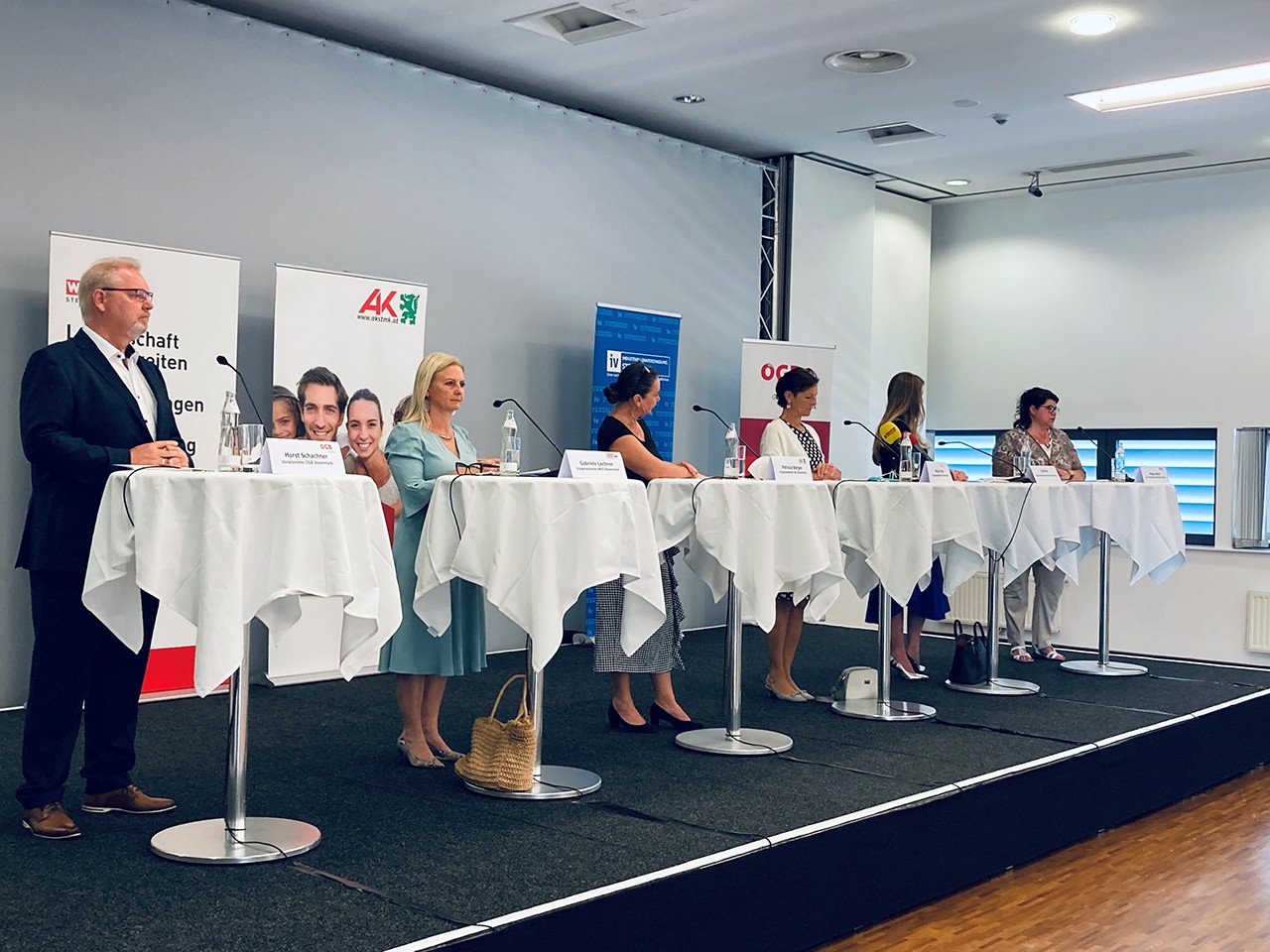 ÖGB Landesvorsitzender Horst Schachner, ÖGB stv. Landesvorsitzende Helga Ahrer, Vizepräsidentin der WKO Steiermark Gabriele Lechner, Vizepräsidentin der AK Steiermark Patricia Berger, Vizepräsidentin der LK Steiermark Maria Pein und stv. Geschäftsführerin der IV Nina Zechner forderten unter anderem einen Rechtsanspruch auf einen flächendeckenden, ganzjährigen, ganztägigen und leistbaren Kinderbildungs- und betreuungsplatz ab dem 1. Lebensjahr, eine bessere Finanzierung für qualitätsvolle Angebote und daraus resultierend eine bessere Vereinbarkeit von Familie und Beruf.