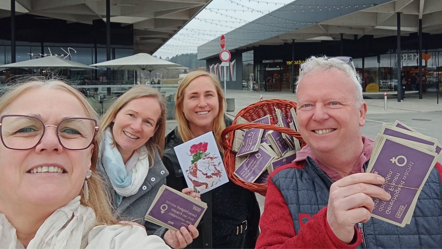 Unter dem Motto „Blumen sind schön – aber sie zahlen keine Miete“ wurden in der Region Informations- und Verteilaktionen organisiert. Diese fanden unter anderem im Hatric Einkaufszentrum in Hartberg sowie in mehreren Betrieben in Weiz statt. Dabei wurden Gespräche mit Arbeitnehmerinnen geführt, Informationsmaterial verteilt und auf die weiterhin bestehenden Herausforderungen für Frauen im Berufsleben aufmerksam gemacht.