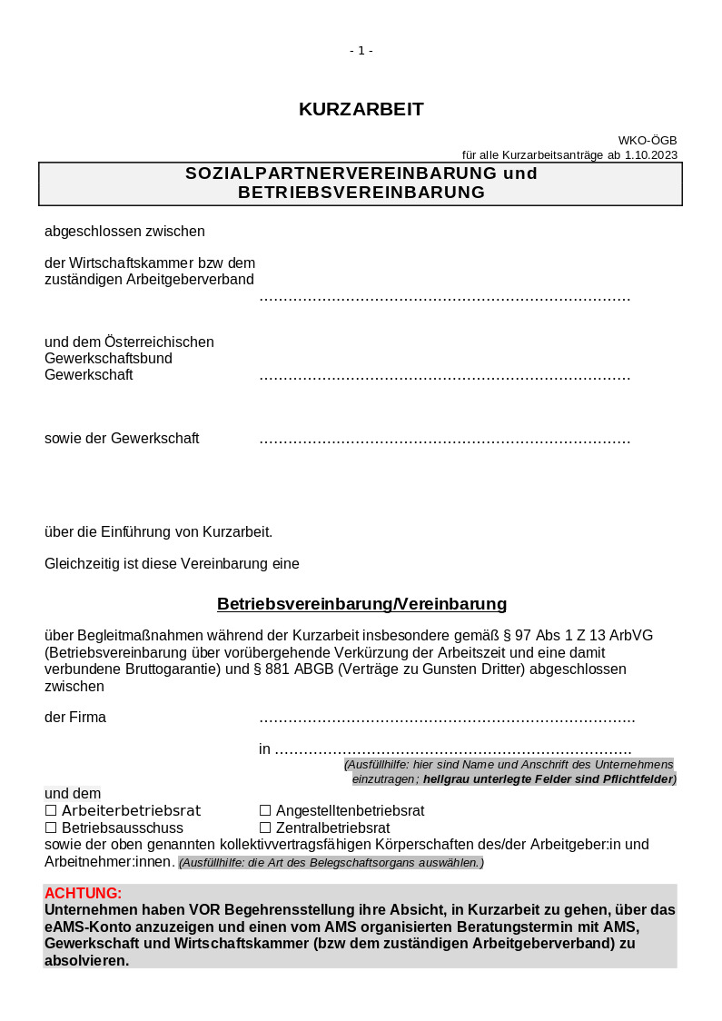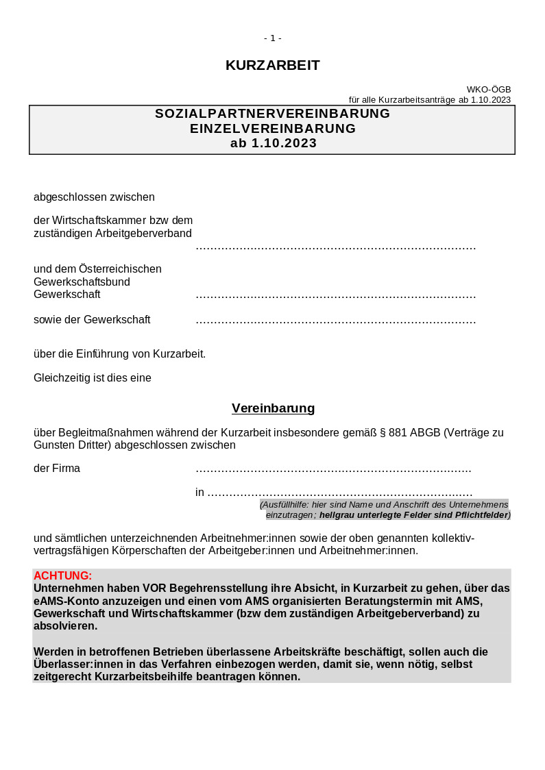In wirtschaftlichen Ausnahmesituationen ist es für Unternehmen manchmal notwendig, mit Beschäftigten Kurzarbeit zu vereinbaren. Dabei werden sowohl Arbeitszeit als auch Einkommen reduziert, um die Kündigung von Beschäftigten zu vermeiden. Der Österreichische Gewerkschaftsbund und die Wirtschaftskammer haben sich mit der Regierung auf ein dauerhaftes Kurzarbeitsmodell (als Folgemodell der Corona-Kurzarbeit) geeinigt, das seit 1. Oktober 2023 gilt.
